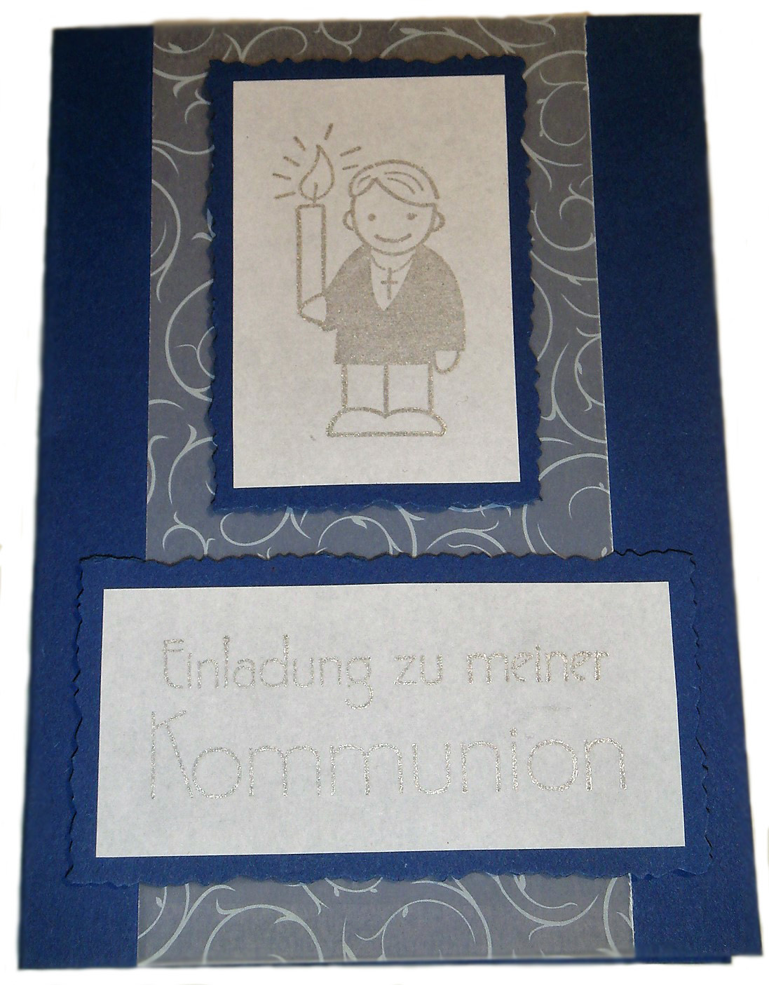 verziert in 3D mit Kärtchen mit silbernem Stempel ( Kommunionkind und "Einladung zu meiner Kommunion" )