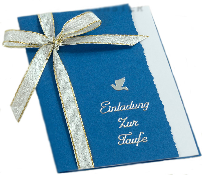 verziert mit Band, silbernem Schriftzug zur Taufe und Taube