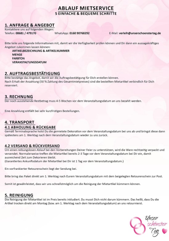 Ihr holt die Dekoration nach Terminabsprache vor der Feier bei uns ab und bringt sie spätestens am 1. Werktag nach der Feier zurück.