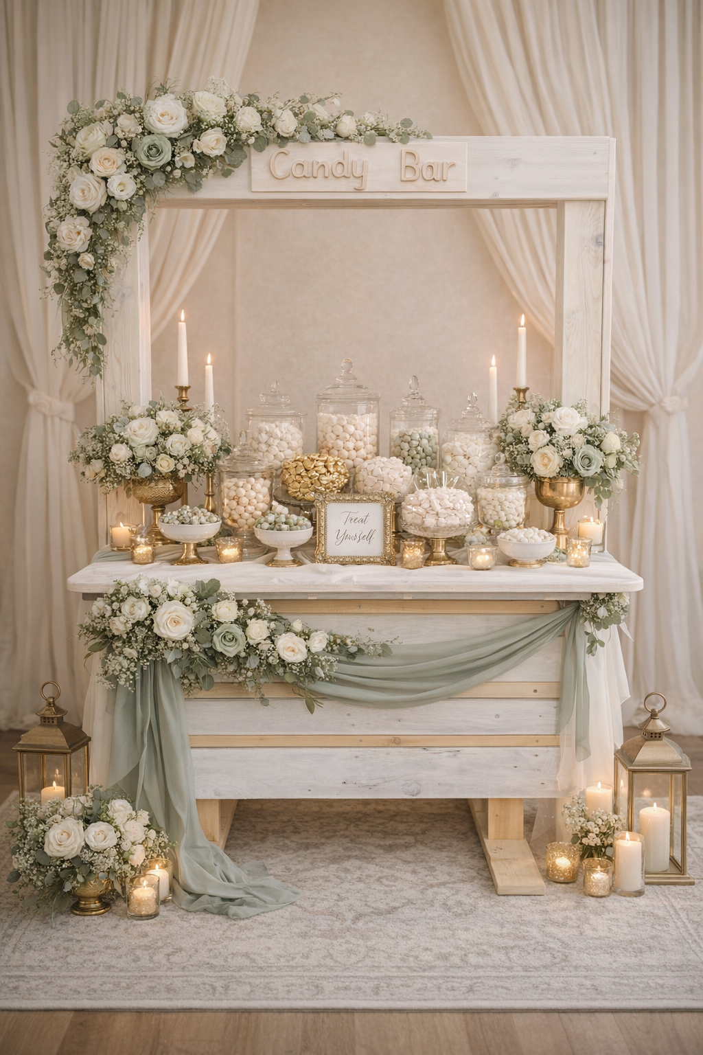 Unsere hochwertige Candybar aus hellem Holz besticht durch ihr zeitloses Design und wird mit edlen Glasgefäßen, stilvollen Kerzenhaltern sowie harmonisch abgestimmter Dekoration präsentiert. Zarte Blumenarrangements und fließende Stoffelemente sorgen für eine warme, einladende Atmosphäre und machen die Candybar zu einem echten Blickfang auf jedem Event.