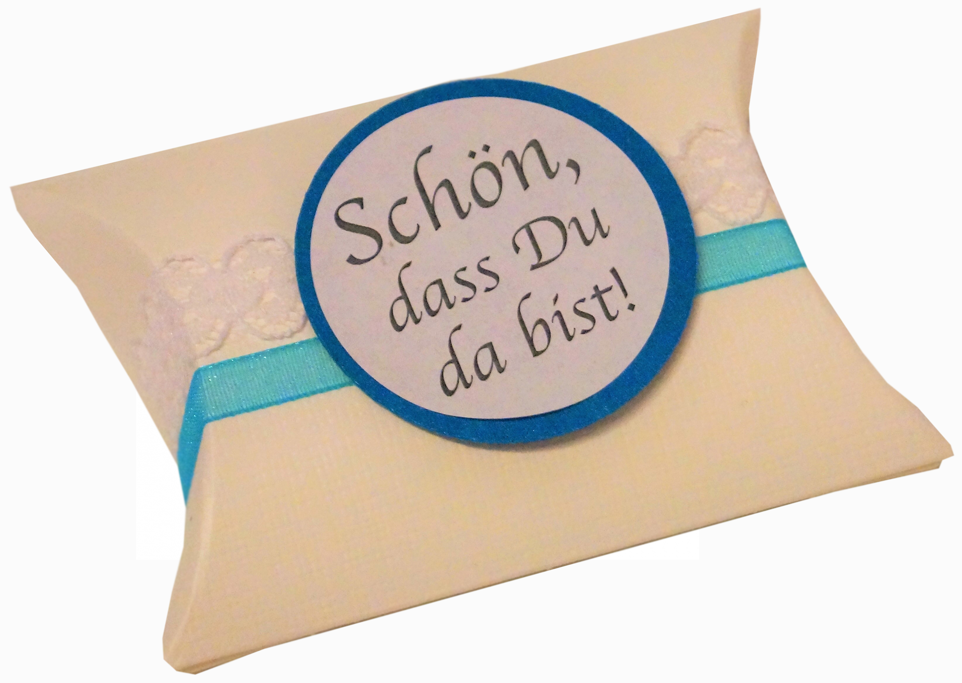 Die Kartonage ist mit Organzaband und Spitze im Vintagestil verziert.