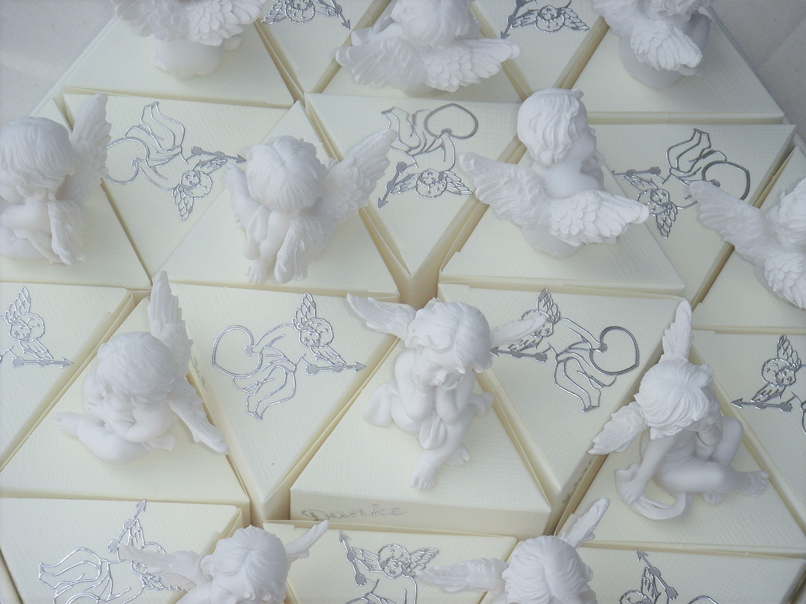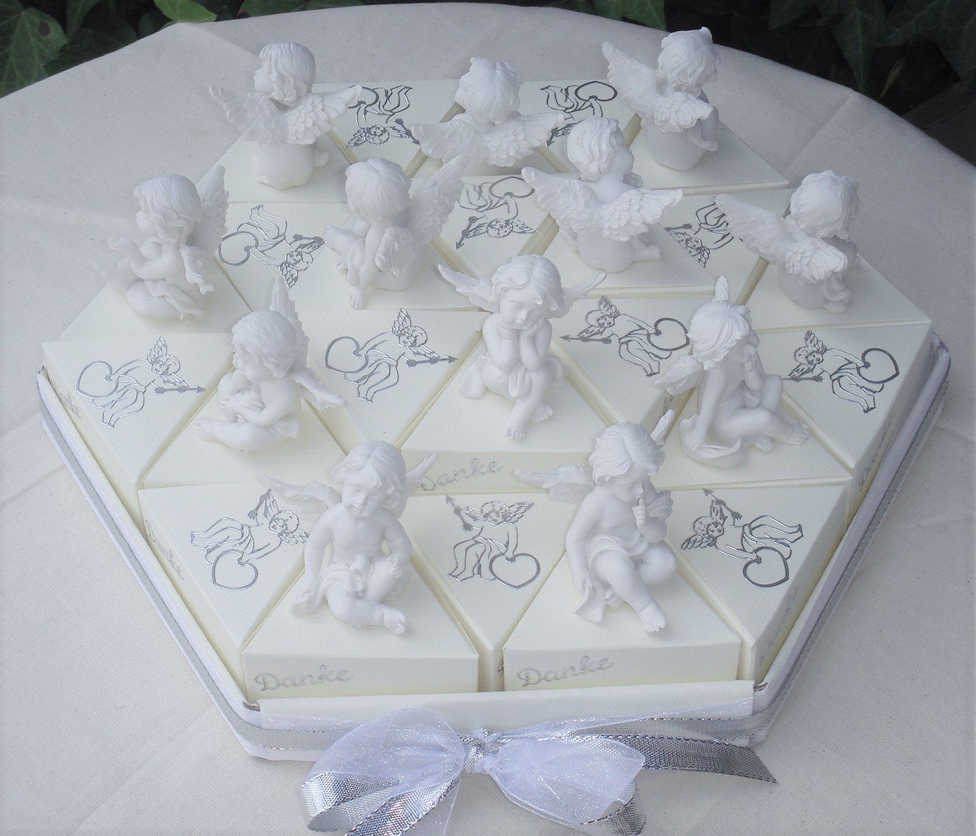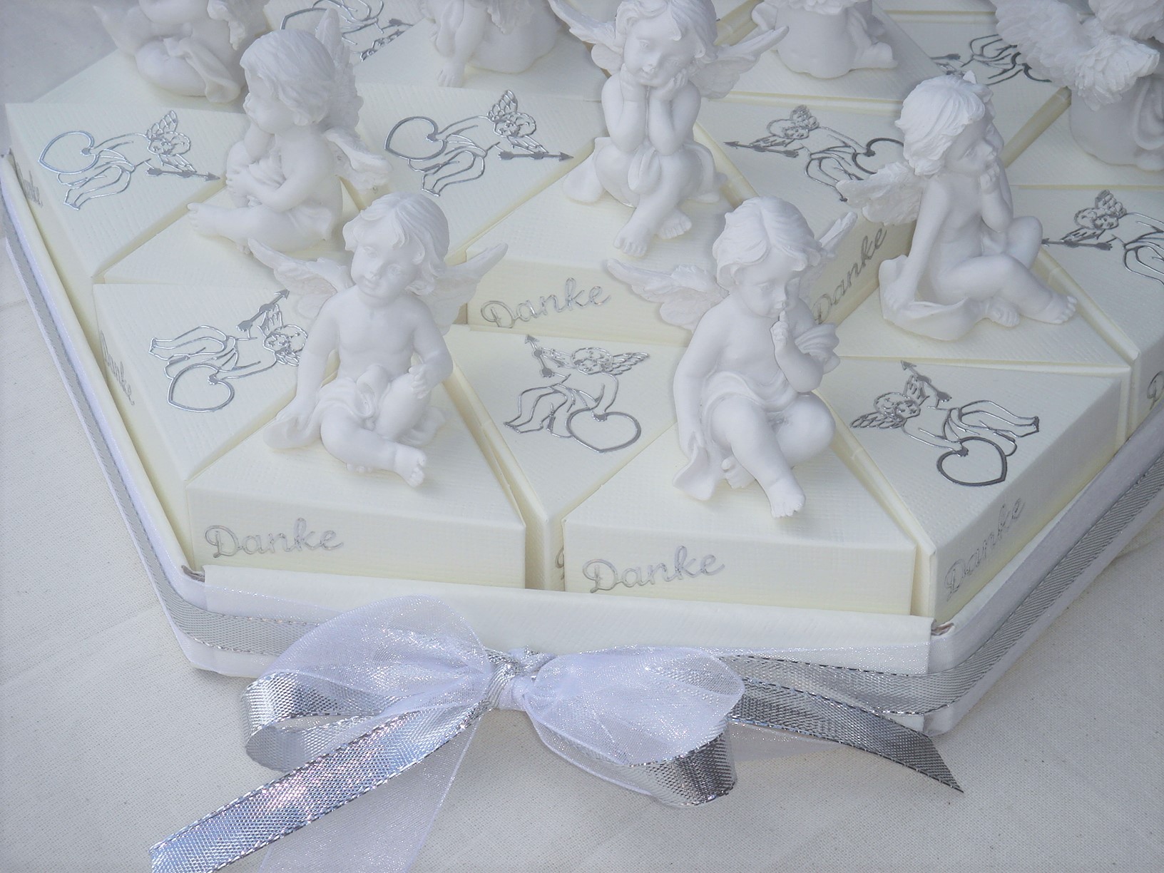 Die eine Hälfte der Gastgeschenke ist mit einem niedlichen Engel Aufkleber, die andere Hälfte ist mit niedlichen Engeln verziert.