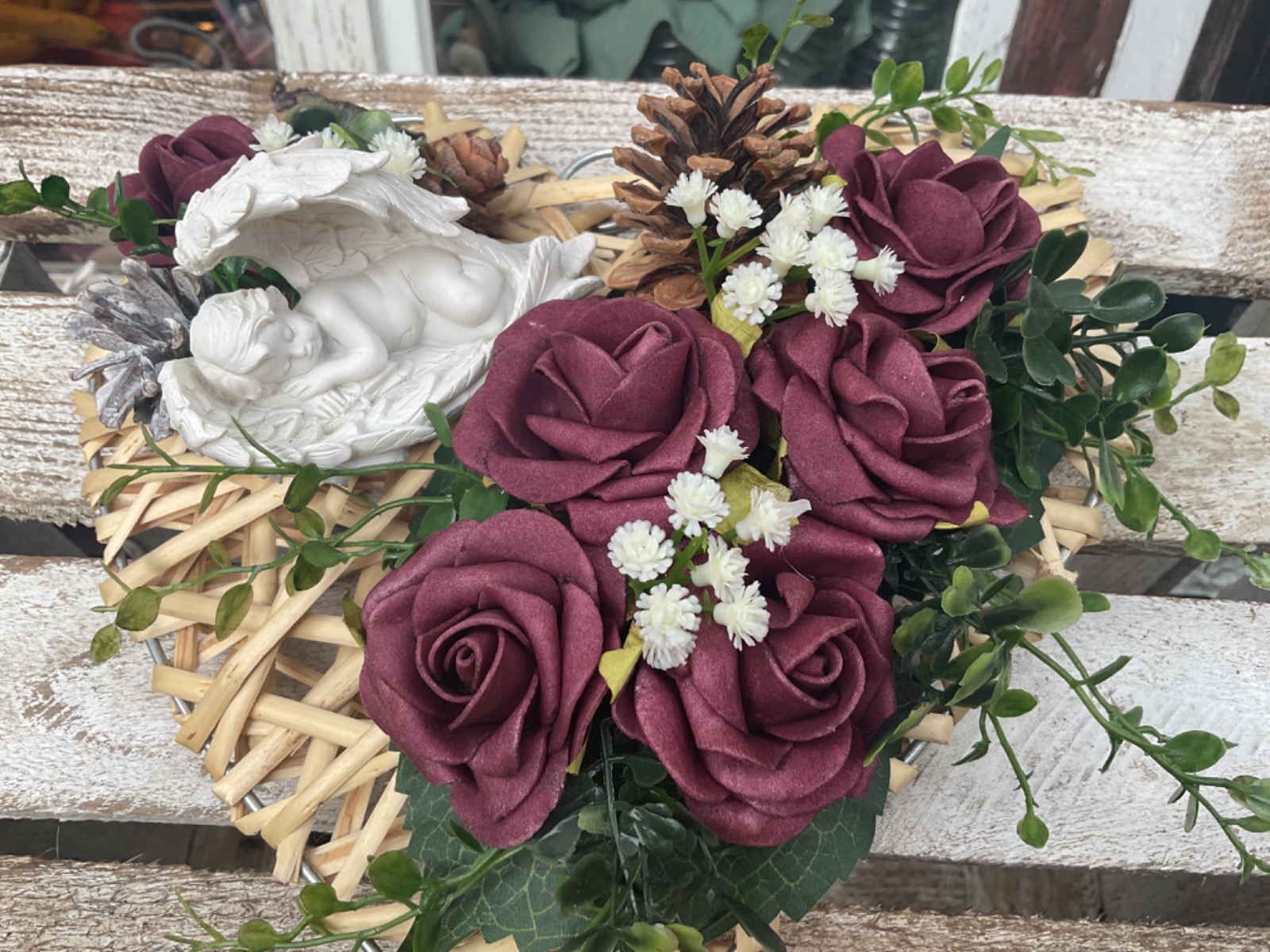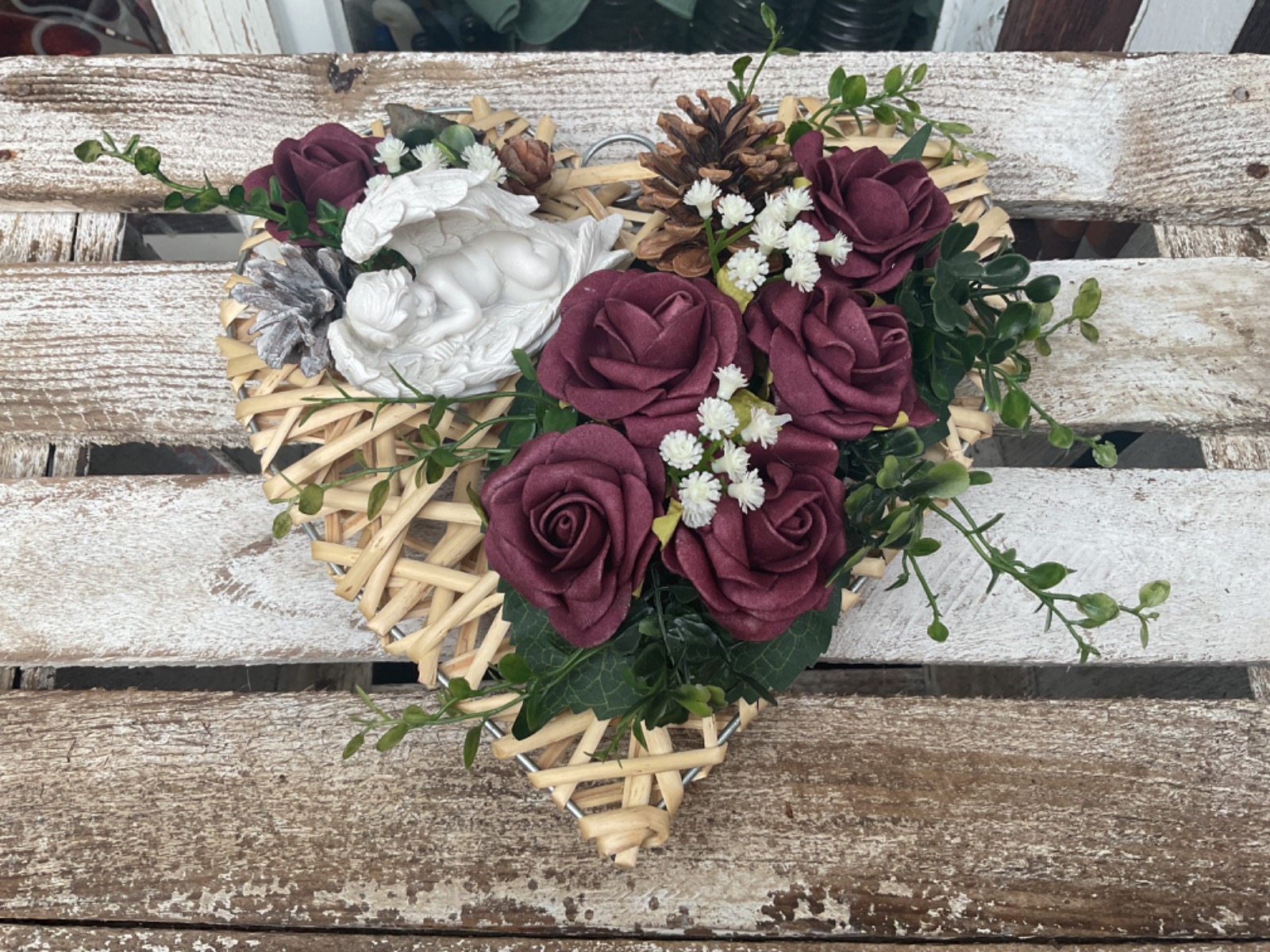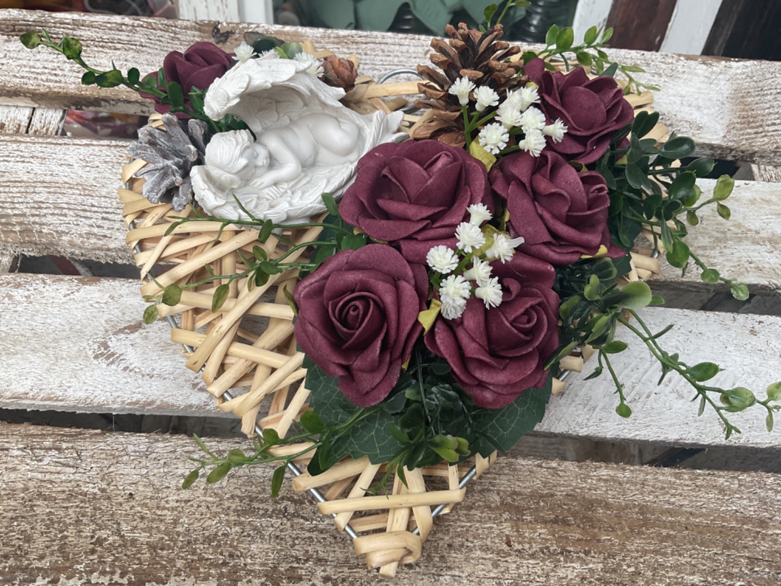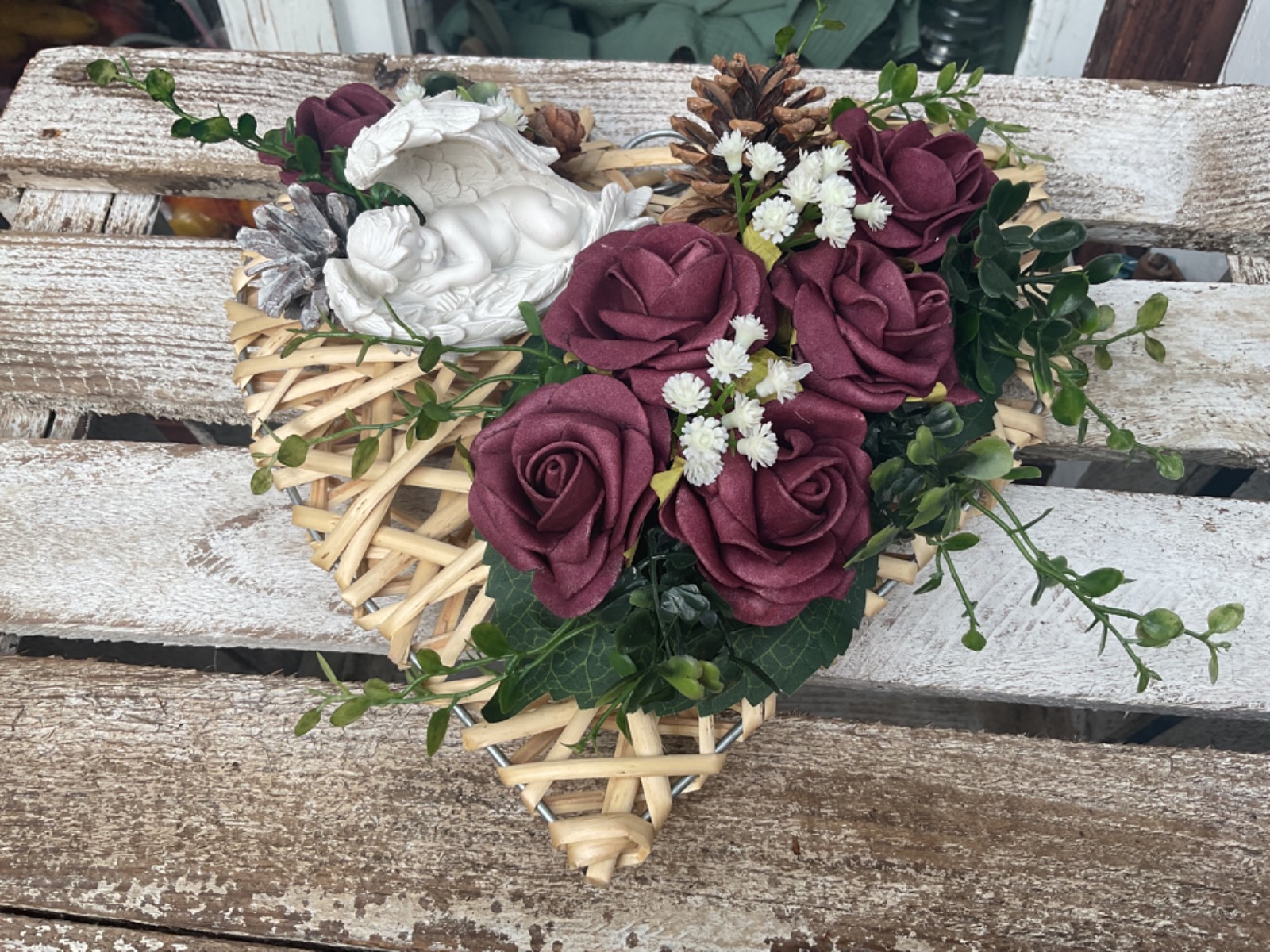 Dieser wunderschöne stilvoll gestaltete Grabschmuck überzeugt durch die Kombination der unterschiedlichen Materialien und Farben. Die Basis besteht aus einem mit hellem Rattan umwickelten Herz. Unterschiedlichste herbstliche Blattwerke, Zapfen, Blüten und Beeren verleihen dem Gesamten nochmals die natürliche Note. Als Highlight ist noch ein Engel mit Flügel angebracht. Die verwendeten Gräser verleihen dem Ganzen noch den letzten Schliff.