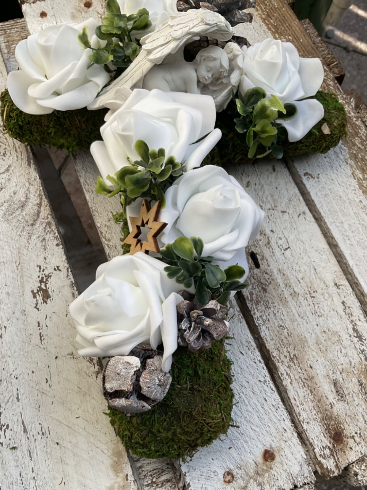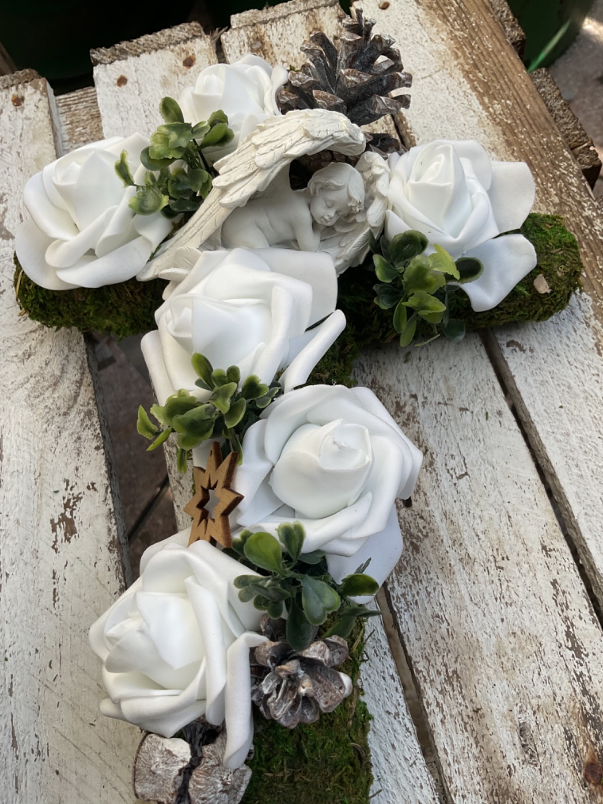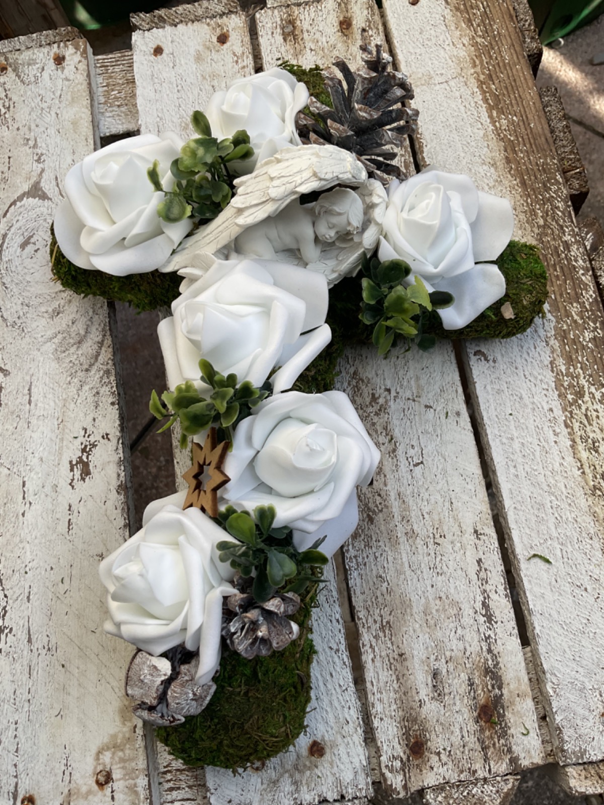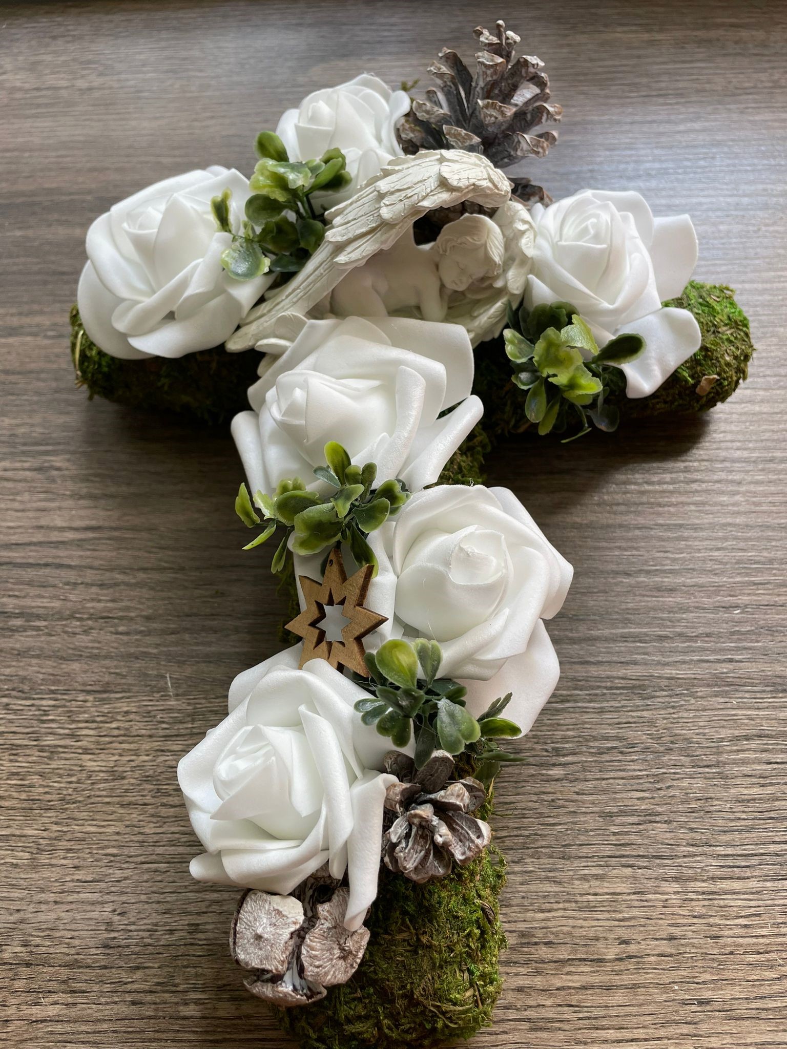 Dieser wunderschöne stilvoll gestaltete Grabschmuck überzeugt durch die Kombination der unterschiedlichen Materialien und dadurch, dass dieser komplett in Naturtönen gehalten ist. Die Basis besteht aus einem Kreuz aus Moos. Unterschiedlichste Blattwerke, Gräser, Zapfen und verschiedene weiße Blüten unterstreichen nochmals die natürliche Note. Als Highlight wurden in der Mitte des Kreuzes ein Engel angebracht.