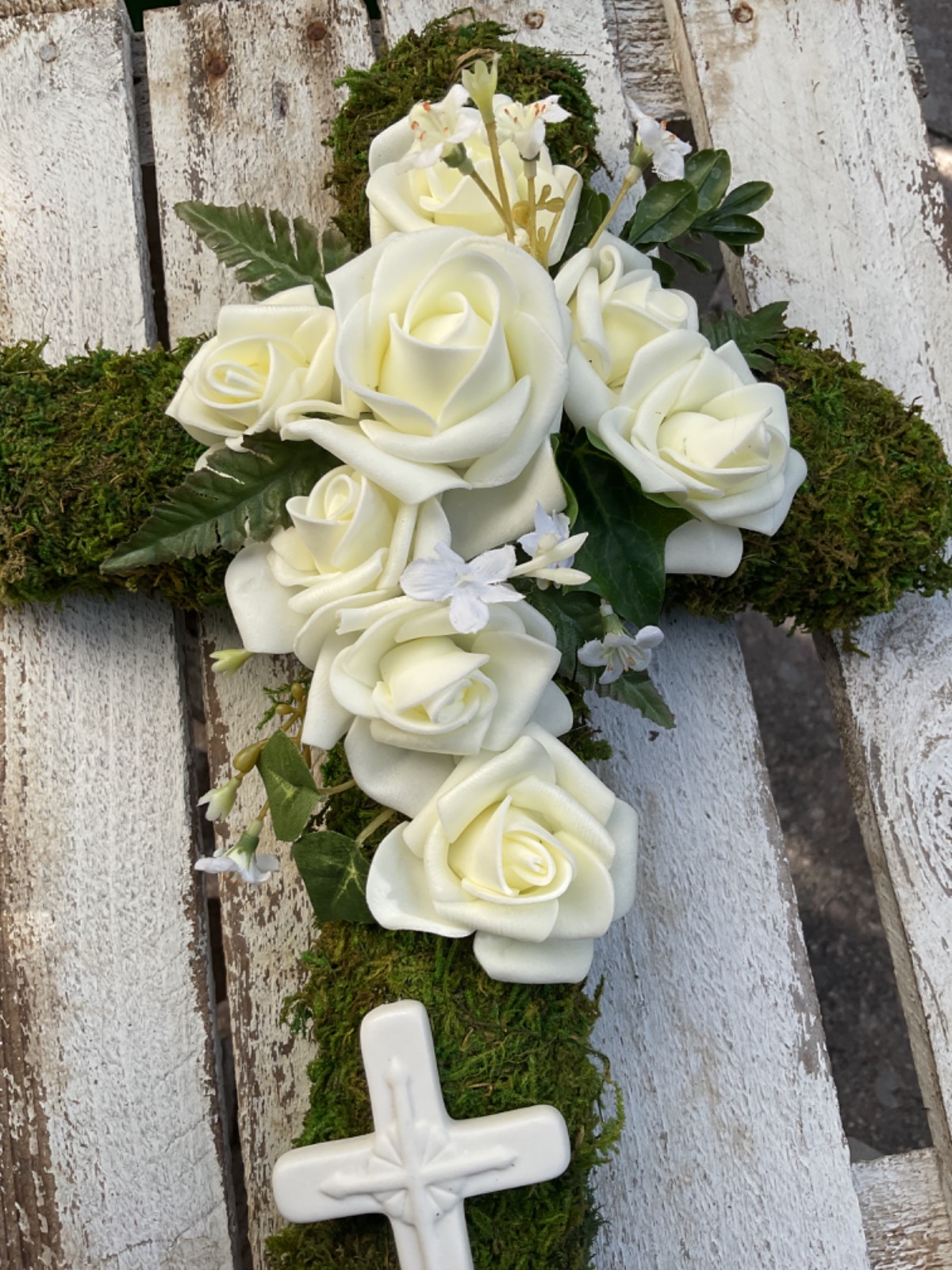 Dieser wunderschöne stilvoll gestaltete Grabschmuck überzeugt durch die Kombination der unterschiedlichen Materialien und dadurch, dass dieser komplett in Naturtönen gehalten ist. Die Basis besteht aus einem Kreuz aus Moos. Unterschiedlichste herbstliche Blattwerke, Gräser, Zapfen und zweierlei verschiedene weiße Blüten unterstreichen nochmals die natürliche Note. Als Highlight wurden in der Mitte des Kreuzes weiße Rosen angebracht. Im unteren Drittel des Kreuzes befindet sich ein Steinkreuz, welches dem Ganzen noch den letzten Schliff verleiht.