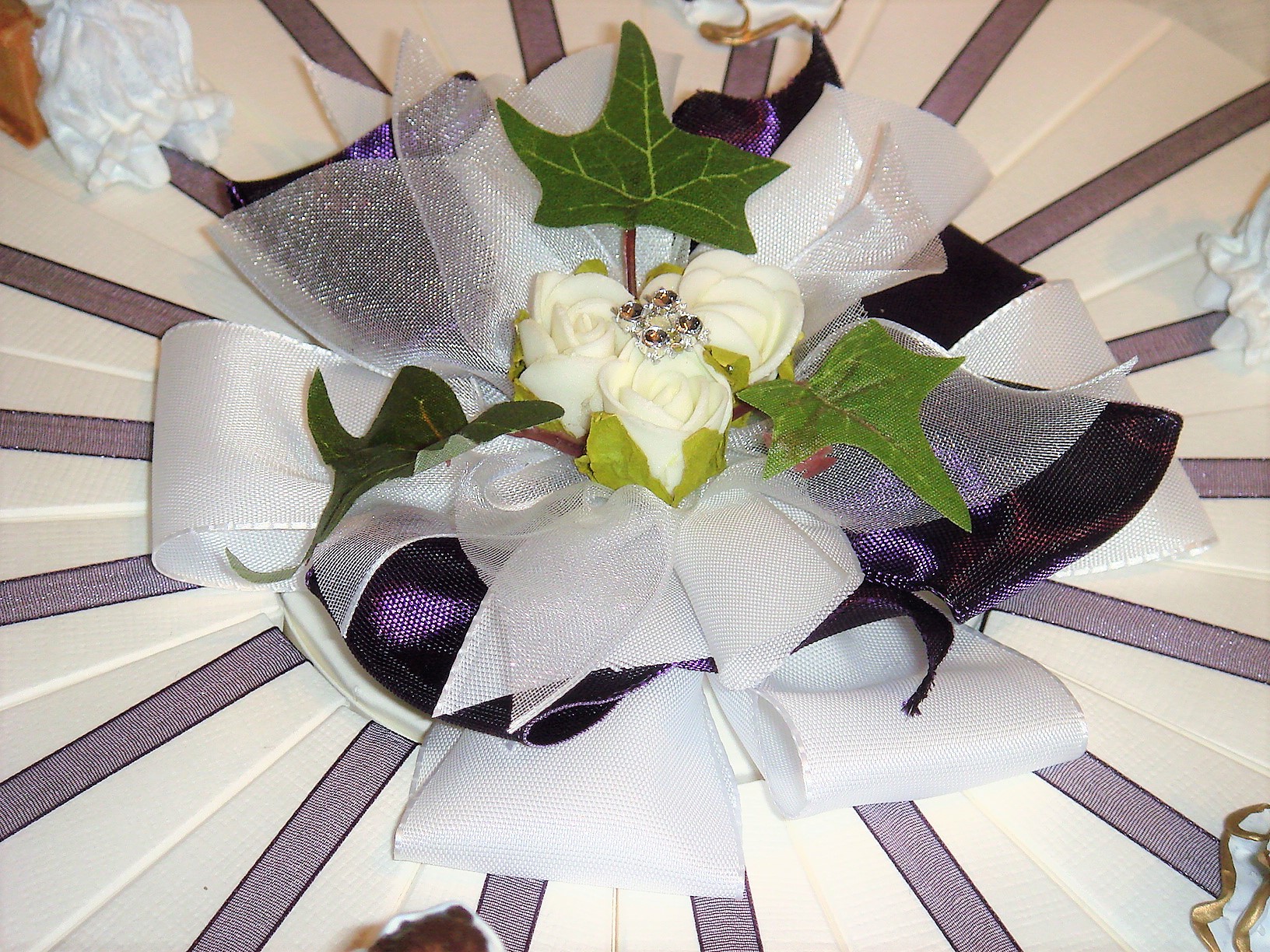 das Arrangement ist verziert mit Strass-Similie, Schleifen, 6 Kommunionfiguren