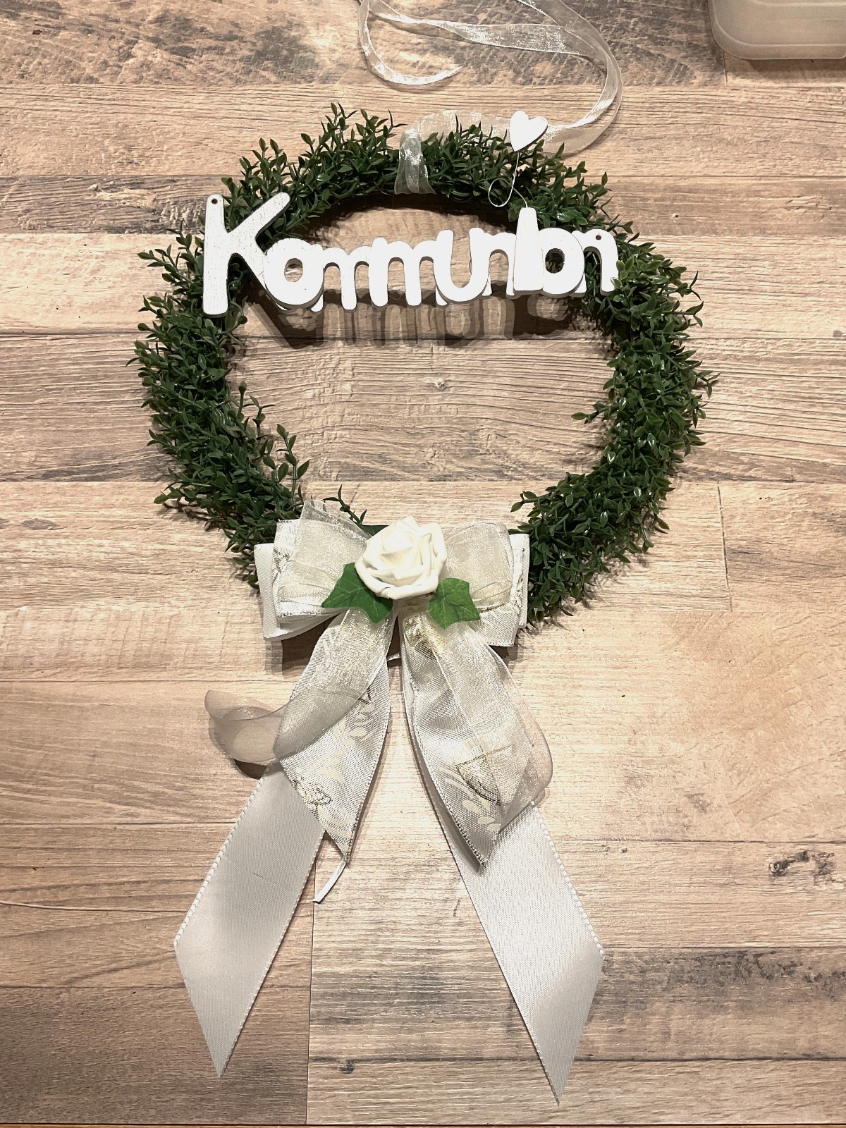 dieser Türkranz wurde mit einer Organzaschleife, bedrucktem Kelch Band und Schriftzug aus Holz verziert