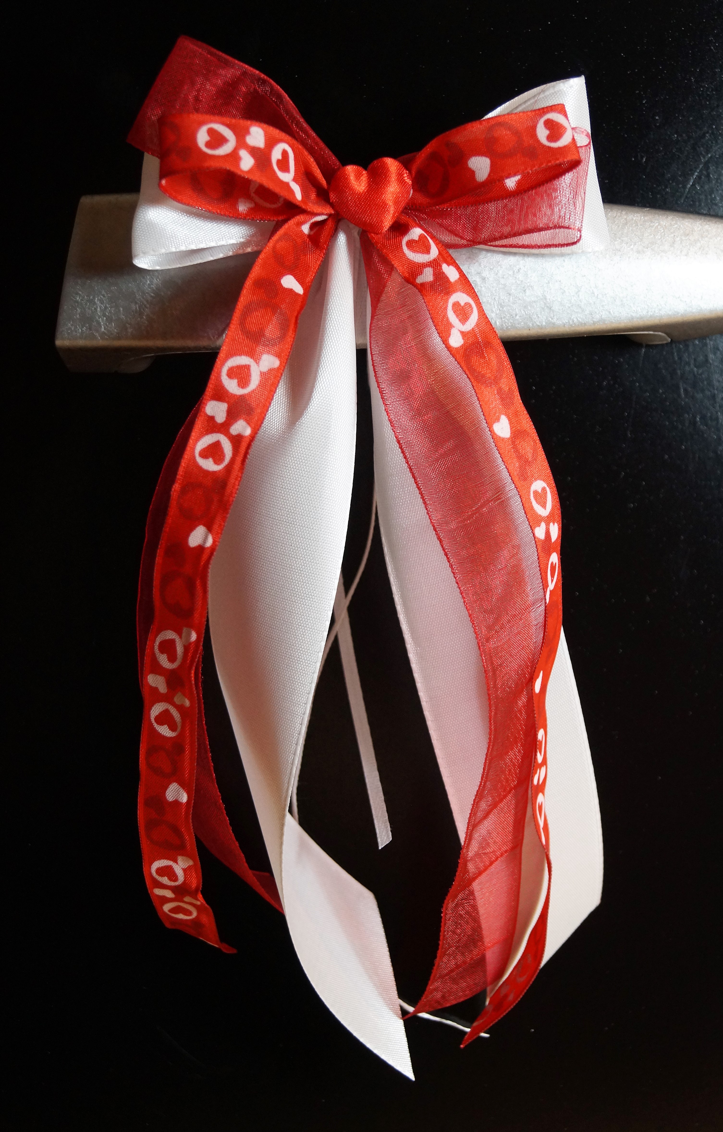 Material : Taftband 4 cm, Organzaband 2,5 cm und Motivband Herz.......verziert mit rotem Satinherz