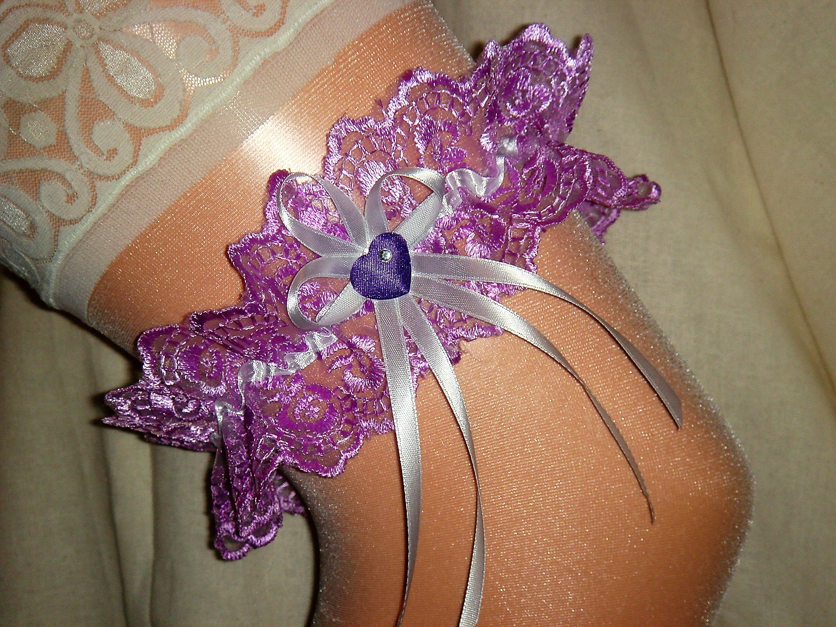 das Strumpfband ist aus 7,5 cm breiter flieder farbener Spitze