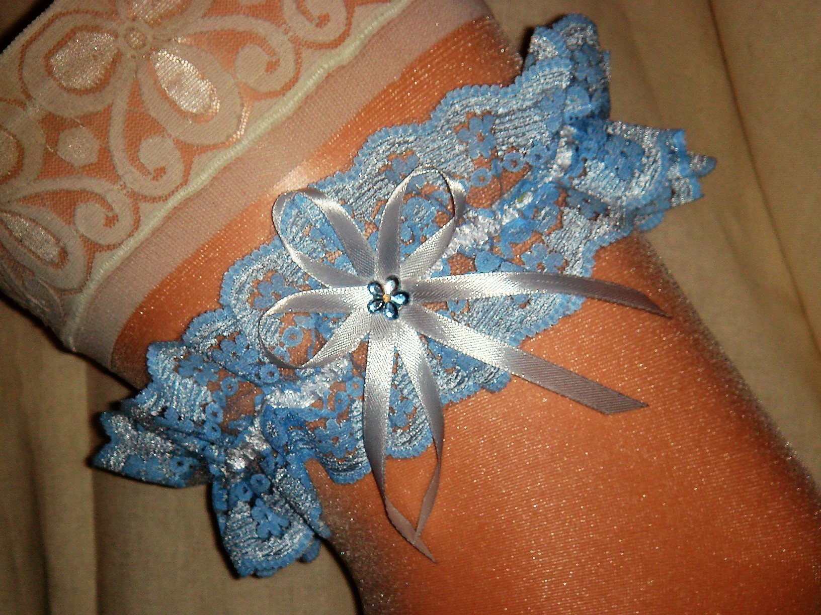 das Strumpfband ist aus 7,5 cm breiter hellblauer Spitze