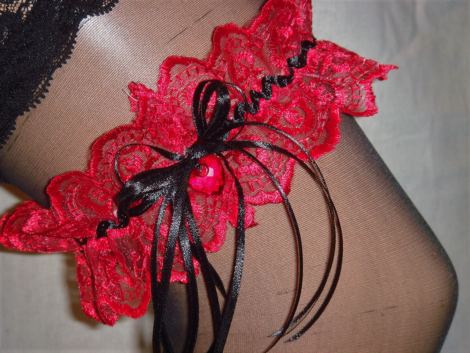 in liebevoller Hangarbeit von mir hergestelltes Strumpfband in rot-schwarz