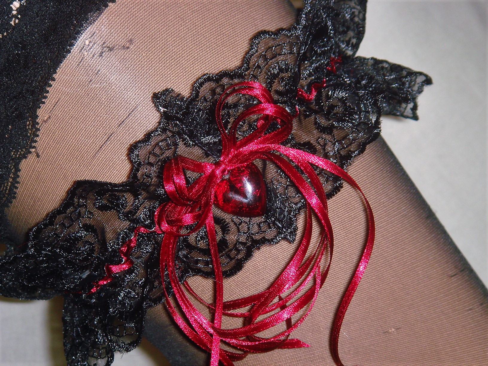 in liebevoller Hangarbeit von mir hergestelltes Strumpfband in schwarz-bordeaux