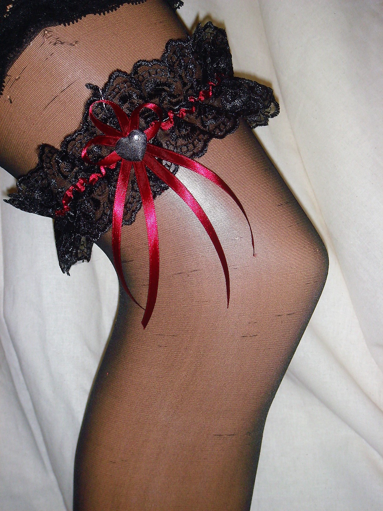 in liebevoller Hangarbeit von mir hergestelltes Strumpfband in schwarz-bordeaux