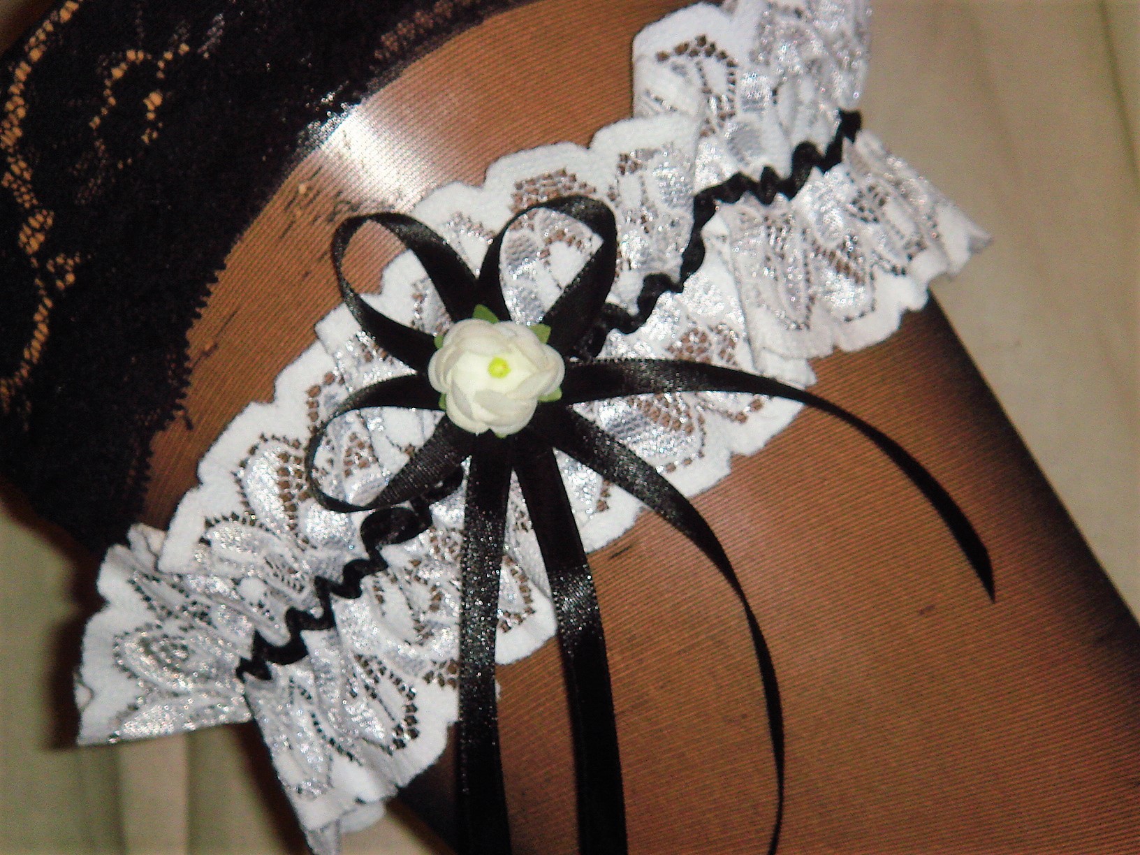 in liebevoller Hangarbeit von mir hergestelltes Strumpfband in weiß-schwarz