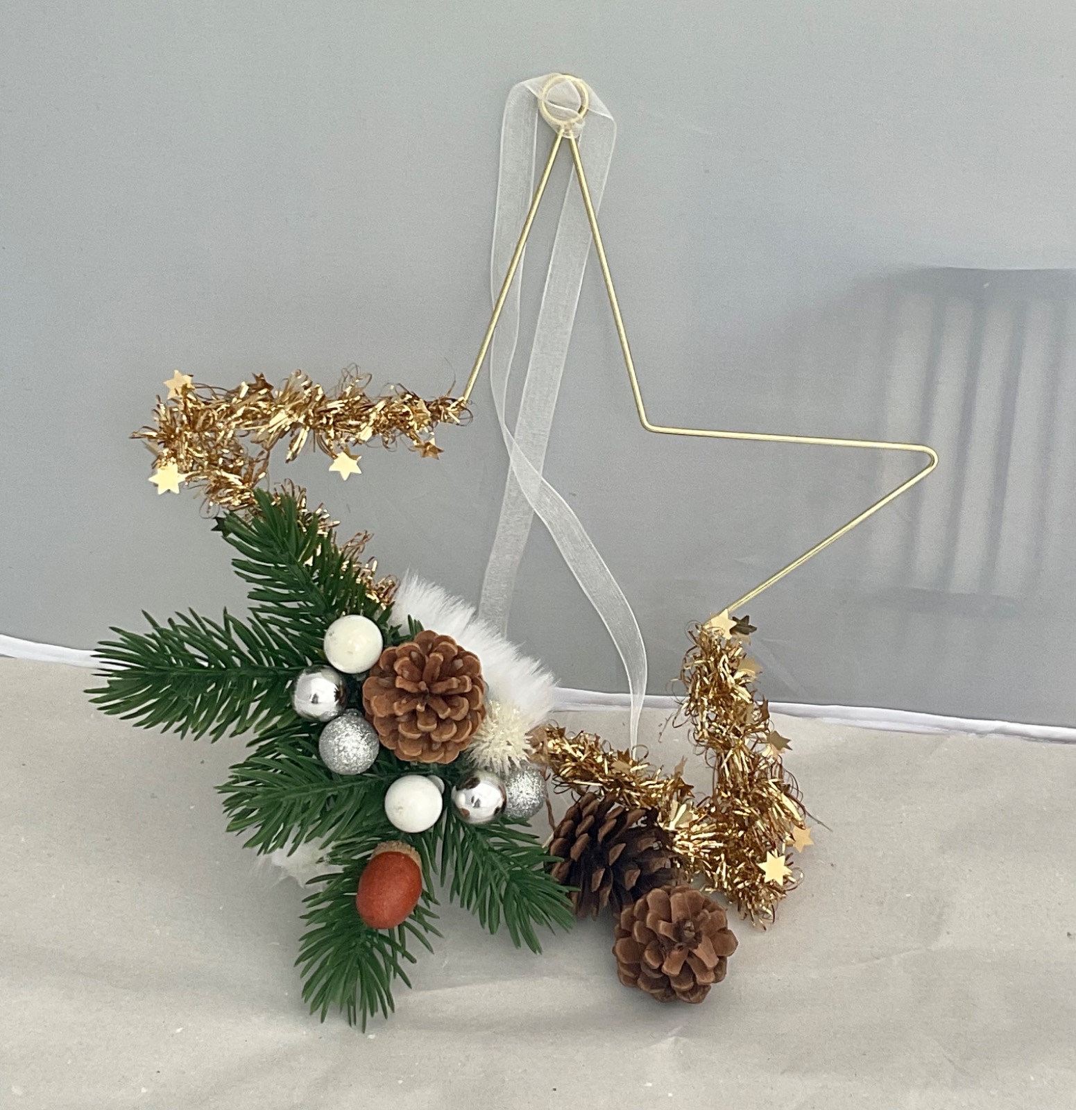 Kranz zum aufhängen, verziert mit verschiedenen Dekoteilen, Weihnachtsmaterialien.