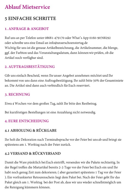 Die Mietartikel müssen bitte von Euch am Montag nach Eurer Hochzeit bzw. am nächsten Werktag nach Eurer Veranstaltung an uns retourniert werden. Das Praktische für Euch ist, dass die Reinigung der Mietartikel von uns übernommen wird und Ihr sie lediglich zu uns zurückbringen bzw. an uns zurücksenden müsst.