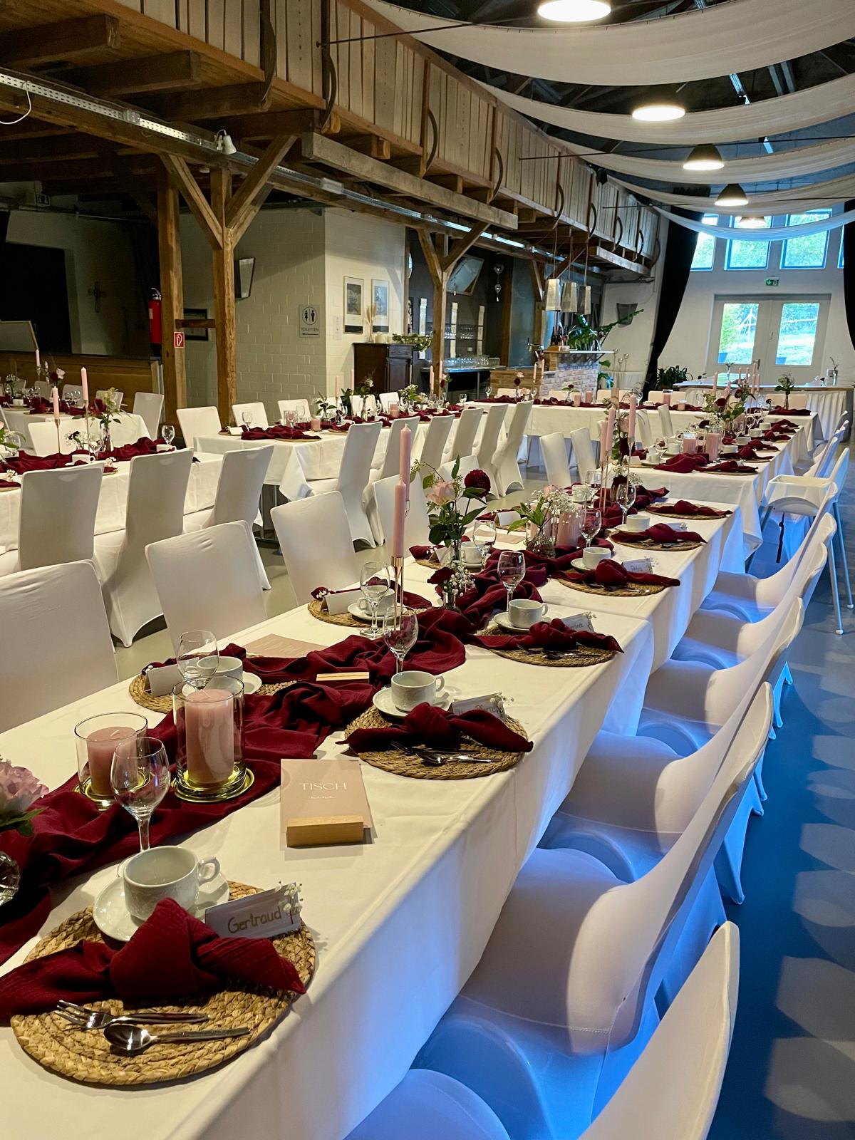 Mobile Preview: Vermietung von Musselin Stoff Tischläufer ca. 300 cm x 40 cm - Farbe bordeaux - beere / 5,50 €