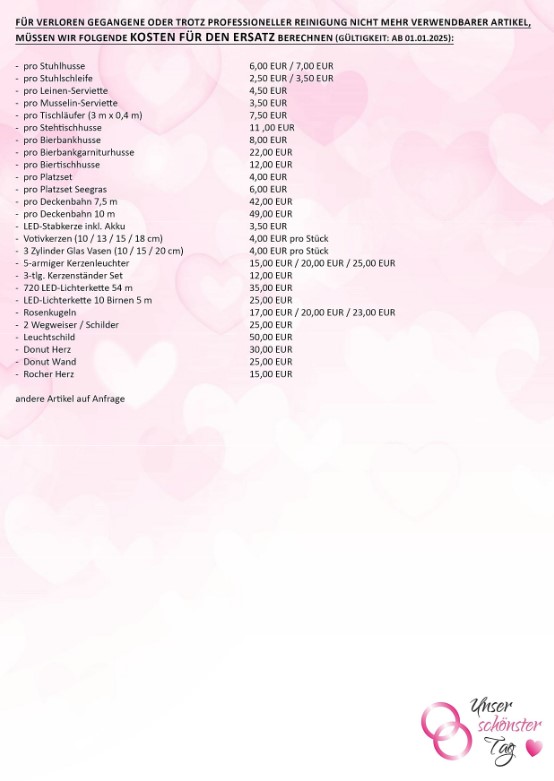 Für verlorene oder trotz Reinigung nicht mehr verwendbare Artikel berechnen wir folgende Preise für den Ersatz: