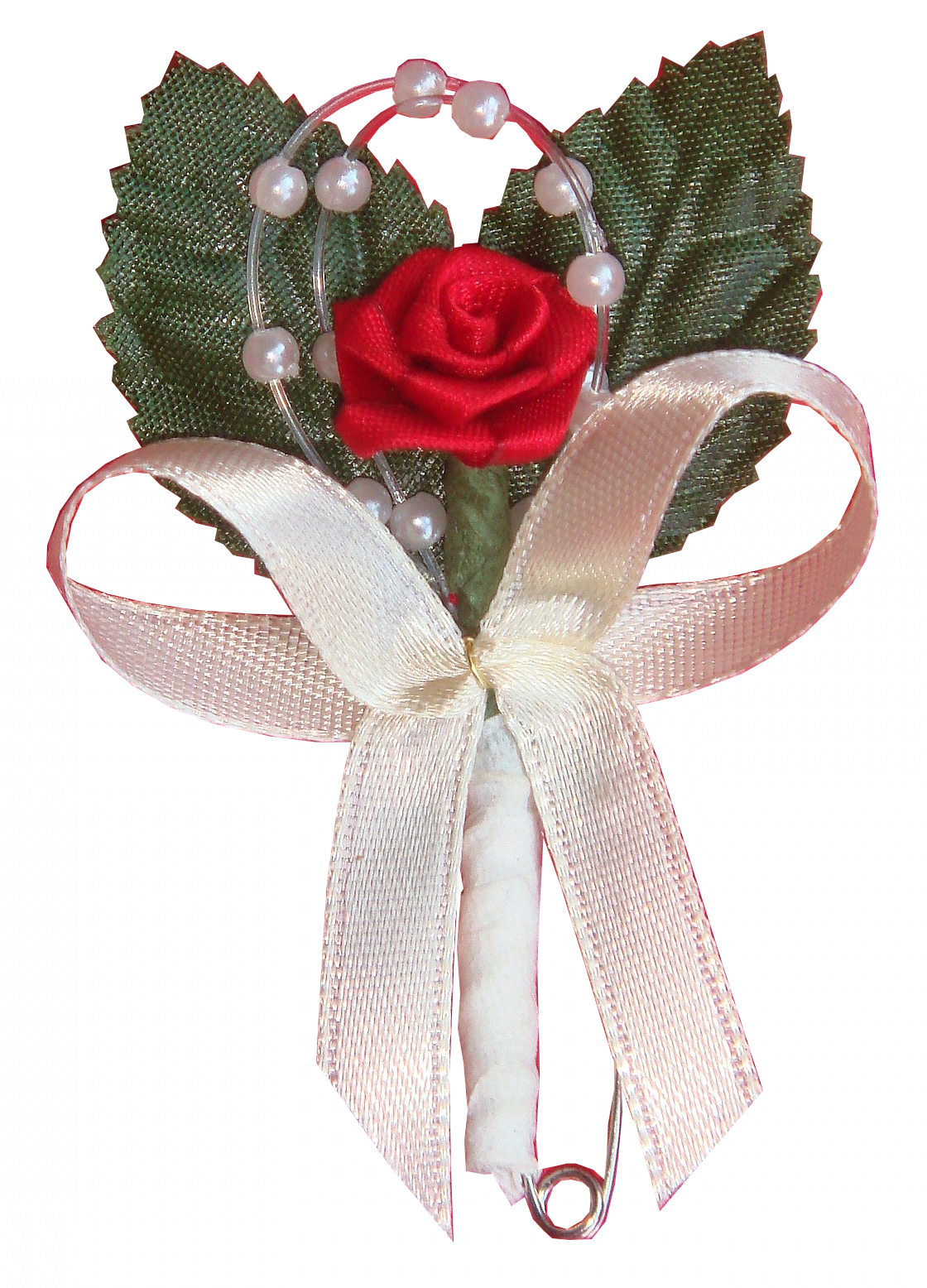 2 kleine Laubblätter, Perlschleife, 1 Rose und Schleife.