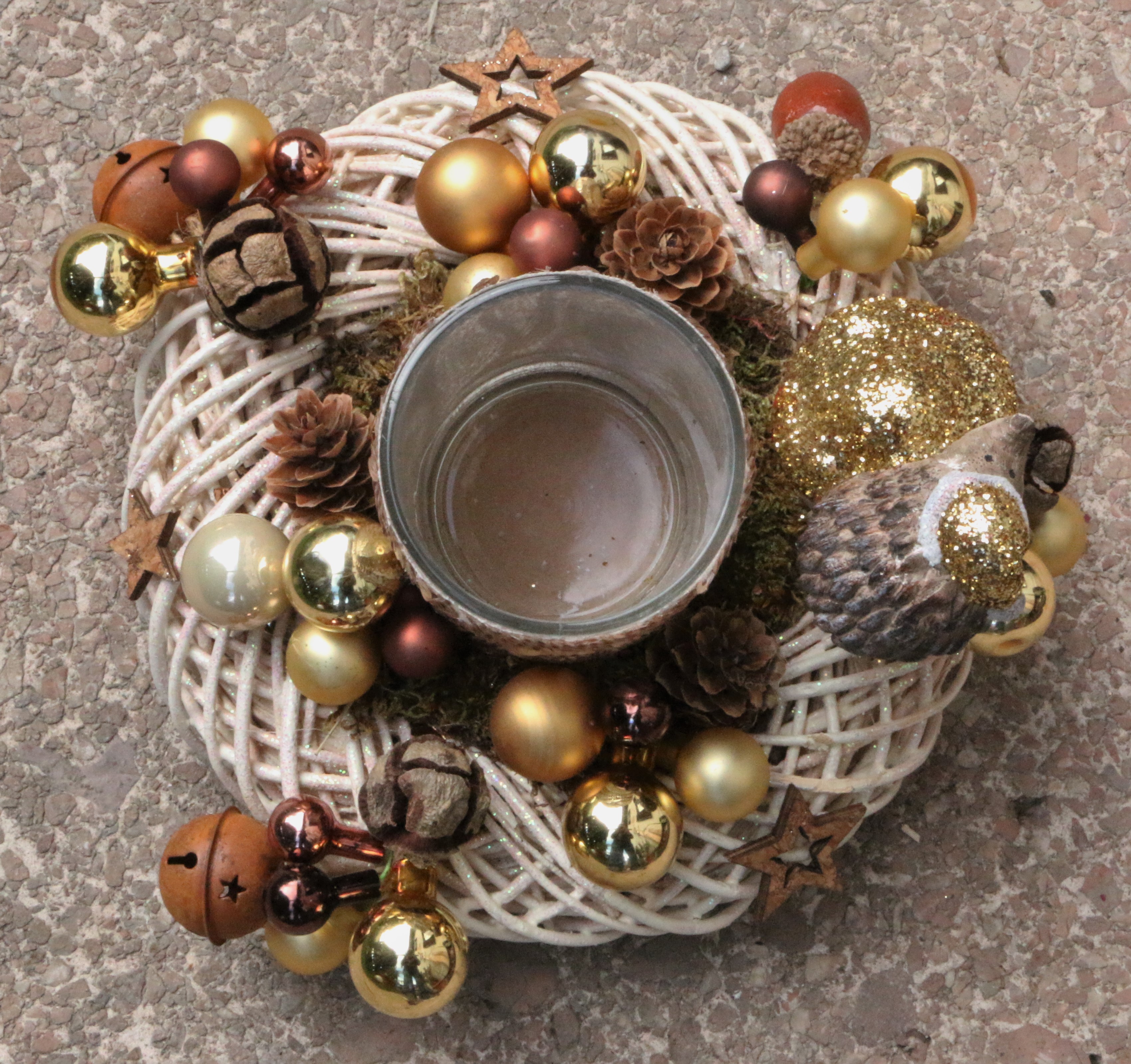 Naturkranz mit edlem Kerzenglas mit Pailetten, glitzerndem Igel, Glaskugeln, Sternen, Spiegelbeeren und Engelshaar