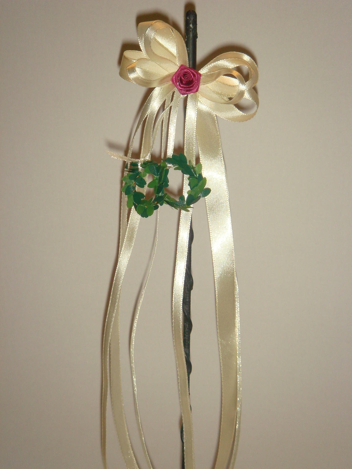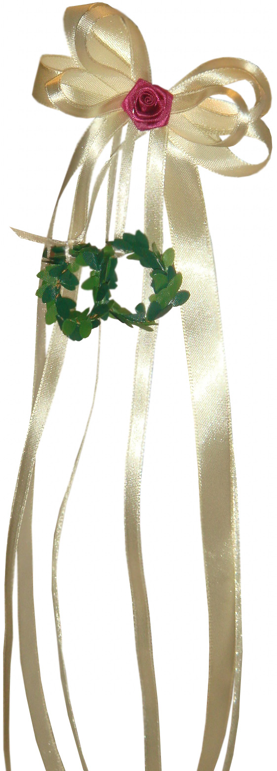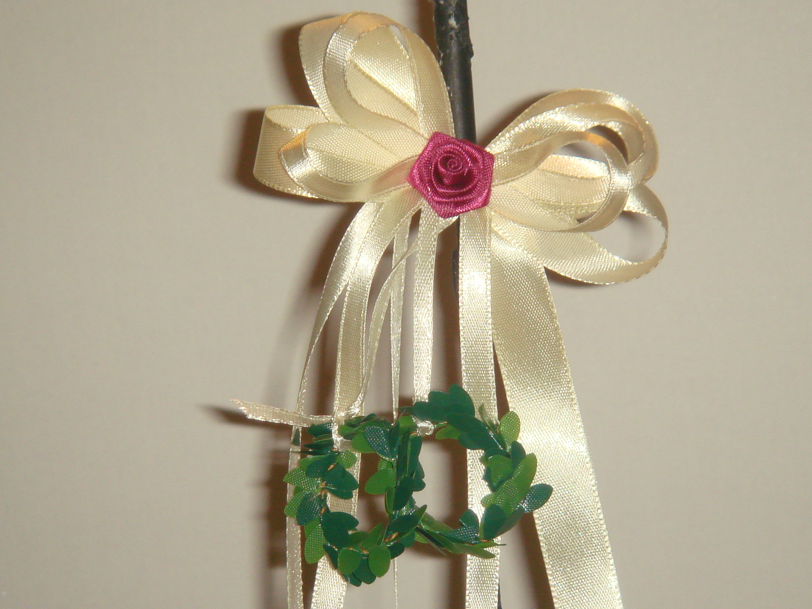 Material : Satinband 1,2 cm und 6 mm, doppelt gebundene Schleife, verziert mit Buchsringen und Satinrose