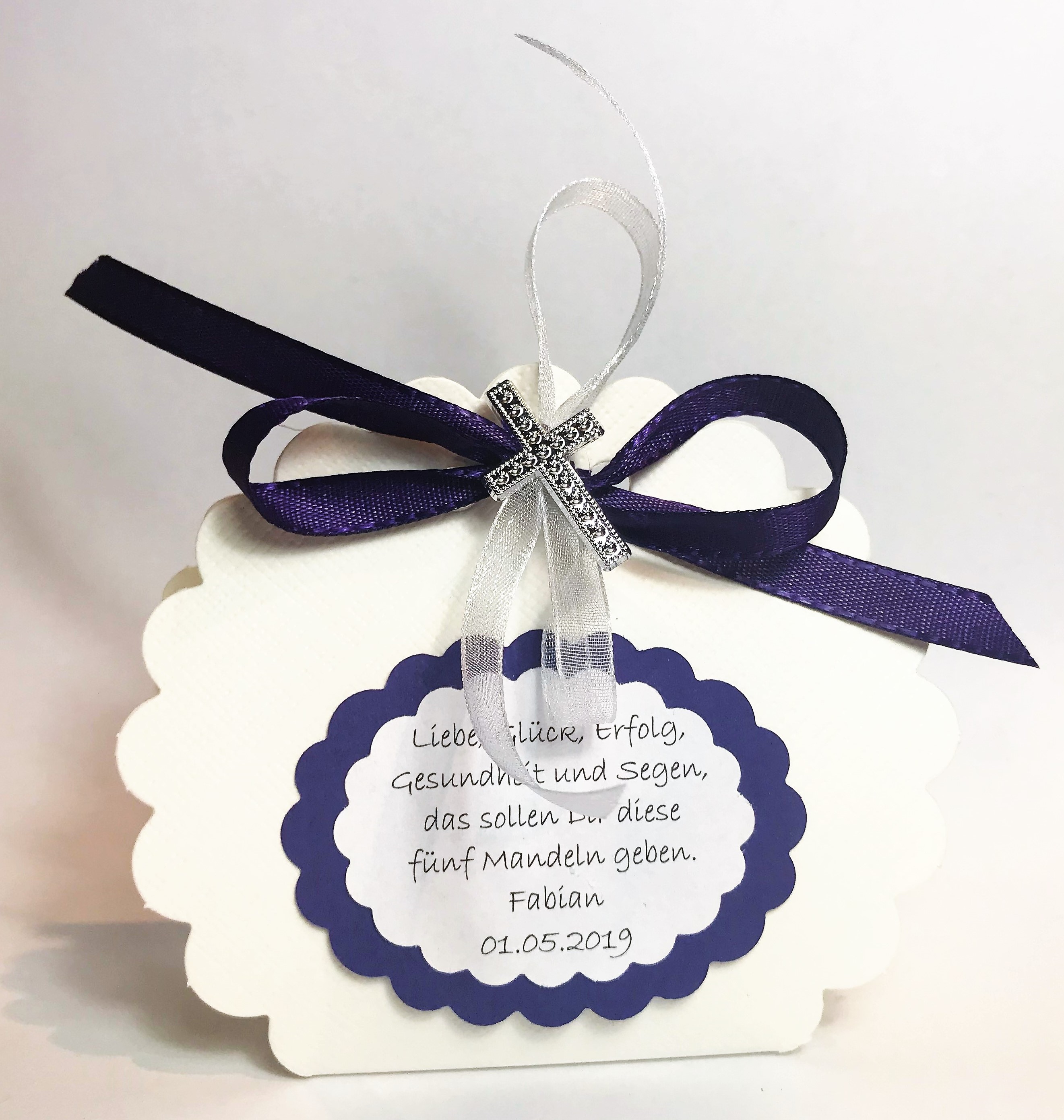die Kartonage ist mit Mandelspruch, Organzaband und Kreuz verziert